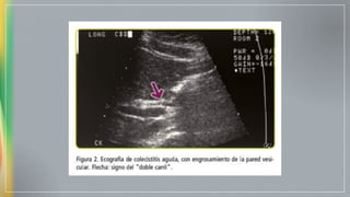 La colecistitis y colelitiasis son afecciones de la vesícula biliar causadas por la presencia de cálculos. La colelitiasis se refiere a la presencia de cálculos en la vesícula biliar sin inflamación, mientras que la colecistitis implica inflamación aguda o crónica de la vesícula biliar debido a la obstrucción de los cálculos. Los síntomas incluyen dolor abdominal y la ecografía es útil para el diagnóstico. El tratamiento de elección para la colecistitis aguda es