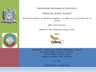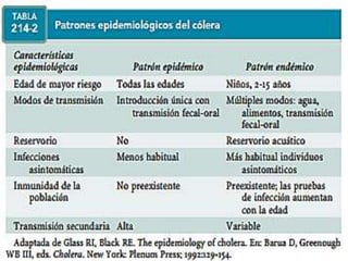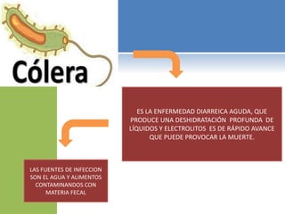 Este documento describe la enfermedad diarreica aguda conocida como cólera. Causada por la bacteria Vibrio cholerae, el cólera produce una deshidratación severa a través de una poderosa toxina que induce la secreción de líquidos en el intestino. Se transmite principalmente por el agua y los alimentos contaminados con materia fecal. El tratamiento consiste en rehidratar rápidamente al paciente utilizando soluciones de rehidratación oral como la solución de la OMS.