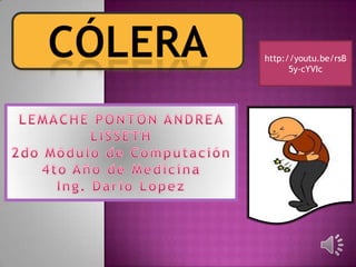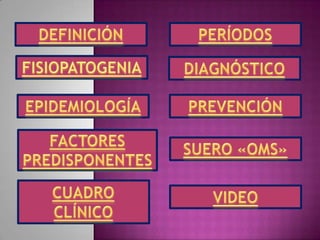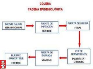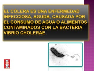 Este documento describe la fisiopatogenia, epidemiología, cuadro clínico, diagnóstico y prevención del cólera. Explica cómo la bacteria atraviesa la barrera gástrica y la mucosa intestinal para producir enterotoxinas, causando diarrea acuosa, vómitos y deshidratación. También describe los periodos de la enfermedad (algido, asfítico y fulminante), factores de riesgo, formas de diagnóstico y un suero casero para prevenir la deshidratación.