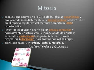 El documento describe los procesos de mitosis y meiosis. La mitosis es la división celular en células somáticas y consta de 6 fases (interfase, profase, metafase, anafase, telofase y citocinesis) que conducen a la formación de dos células hijas idénticas. La meiosis consta de dos divisiones celulares y produce 4 células haploides a partir de una célula diploide, y comprende las fases de profase I, metafase I, anafase I, telofase I, y luego profase