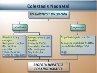 El documento aborda la embriología y anatomía del hígado y el árbol biliar, así como las causas y diagnóstico de la colestasis y ictericia neonatal. Se discuten las variaciones anatómicas y los protocolos de diagnóstico y tratamiento, destacando el procedimiento de Kasai para atresia biliar y la importancia del manejo postoperatorio. Además, se menciona la etiopatogenia y complicaciones relacionadas con quistes del colédoco en pediatría.