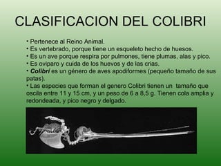 El documento describe las características del colibrí. Pertenece al reino animal y es un ave pequeña nativa de América. Construye nidos en forma de copa y se alimenta principalmente de néctar de flores, aunque también come insectos para alimentar a sus crías. El colibrí tiene un vuelo muy energético y necesita comer constantemente debido a su alto metabolismo.
