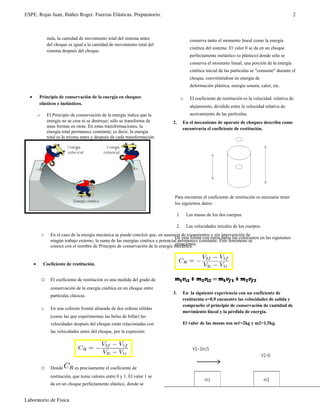 Este documento trata sobre colisiones elásticas e inelásticas. Explica que una colisión elástica conserva la energía cinética total del sistema, mientras que una colisión inelástica convierte parte de la energía cinética en otras formas de energía. También define el coeficiente de restitución y describe cómo se puede usar para calcular las velocidades después de una colisión.