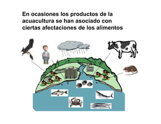 Este documento presenta información sobre patógenos comunes en alimentos de acuacultura como Vibrio parahemolyticus, Salmonella, Escherichia coli, Listeria monocytogenes y Clostridium botulinum. Explica los síntomas, fuentes y factores de riesgo de cada patógeno. También cubre temas como el crecimiento bacteriano, factores que permiten la supervivencia de patógenos y brotes asociados con alimentos contaminados. El objetivo es proporcionar conocimientos básicos sobre estos patógenos de alimentos y