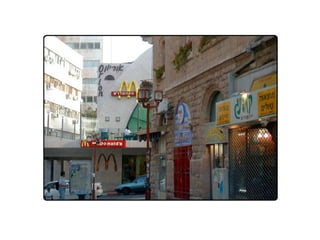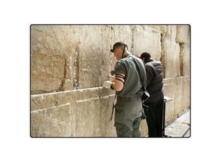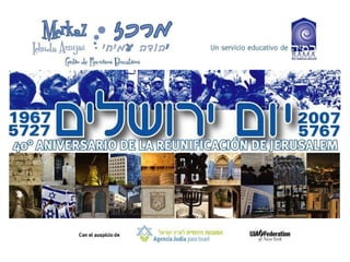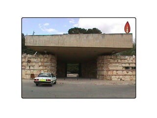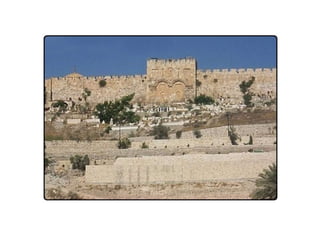 El documento describe diferentes montes que rodean a Jerusalén y lo que cada uno representa. El Monte Moriá representa lo religioso para el judaísmo como lugar del Templo. El Monte de los Olivos enfatiza la redención y esperanza. Monte Sión fue el sitio original de Jerusalén y hogar del Rey David. Monte Scopus ofrece una vista panorámica y alberga instituciones educativas. El cementerio militar conmemora figuras sionistas en el oeste.
