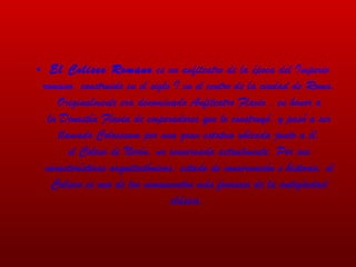 El Coliseo Romano fue construido en el siglo I d.C. en Roma como un anfiteatro para albergar espectáculos públicos como peleas de gladiadores y caza de animales. Podía albergar a 50.000 espectadores distribuidos en 80 filas. Siguió utilizándose durante casi 500 años hasta el siglo VI d.C. A lo largo de la Edad Media, el Coliseo fue saqueado para utilizar sus materiales en otras construcciones y albergó viviendas y talleres. Hoy en día es el monumento más visitado de R