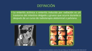 Este documento describe la colitis actínica o enteritis inducida por radiación. Explica que es un trastorno del intestino delgado y grueso que ocurre durante o después de radioterapia abdominal o pélvica. Detalla los factores que determinan su aparición, su fisiopatología, manifestaciones clínicas, diagnóstico, tratamiento médico y quirúrgico. Resalta que la radioterapia afecta principalmente el recto, sigmoides e intestino delgado y que las dosis altas de radiación aumentan el ries