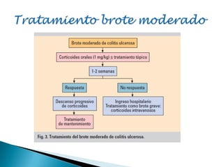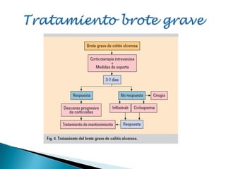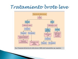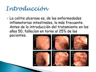 La colitis ulcerosa es la enfermedad inflamatoria intestinal más frecuente. Se diagnostica mediante una serie de criterios clínicos, analíticos, endoscópicos e histológicos. El tratamiento incluye aminosalicilatos, corticoides, inmunomoduladores e incluso cirugía en casos graves o refractarios. Se requiere un seguimiento periódico para controlar la enfermedad y posibles complicaciones.