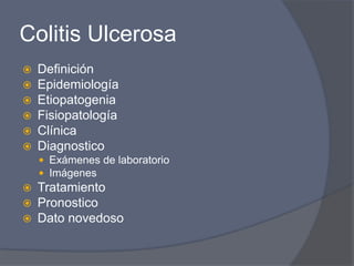 La colitis ulcerosa es una enfermedad inflamatoria del colon que afecta la mucosa y submucosa de forma continua desde el recto hacia arriba. Su etiología es desconocida pero involucra una respuesta inmune anormal y factores ambientales en personas genéticamente predispuestas. Sus síntomas incluyen diarrea con moco y sangre. El diagnóstico se realiza mediante colonoscopia y biopsia. El tratamiento incluye antiinflamatorios y corticoides para los brotes, y el mantenimiento con antiinflam