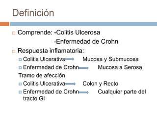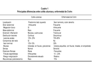 Este documento describe la colitis ulcerosa y la enfermedad de Crohn. La colitis ulcerosa es una inflamación de la mucosa del colon que se extiende de forma continua desde el recto hacia el colon ascendente. La enfermedad de Crohn puede afectar cualquier parte del tracto gastrointestinal de forma segmentaria y trasmural. Ambas enfermedades tienen causas genéticas y ambientales no definidas completamente y se caracterizan por una inflamación crónica del intestino.