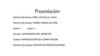 Este documento presenta el collage personal de Ariel Antonio del Angel, un estudiante de 1er grado en la Escuela Universidad del Noreste. El collage contiene 8 fotos que muestran diferentes momentos en la vida de Ariel, incluyendo cuando era niño en el kinder, festivales navideños y de día de las madres, su graduación de primaria, y fotos tomadas en la plaza y el cine.