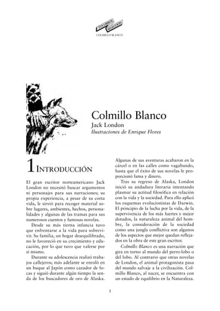 Este documento presenta la introducción y el argumento de la novela Colmillo Blanco de Jack London. La introducción resume la vida de London y explica cómo sus experiencias personales inspiraron sus obras. El argumento se divide en cinco partes que describen la vida de Colmillo Blanco desde su nacimiento hasta su adopción por una nueva familia humana.