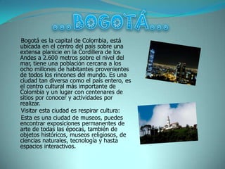 Bogotá es la capital y ciudad más importante de Colombia. Con una población de casi 8 millones de habitantes provenientes de todo el país y el mundo, Bogotá se encuentra a 2600 metros sobre el nivel del mar en la Cordillera de los Andes y es el principal centro cultural, económico y político de la nación.