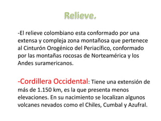 Colombia tiene un relieve montañoso conformado por tres cordilleras: la Occidental, la Central y la Oriental. La Central es la más elevada y contiene los volcanes más altos. Las principales ciudades de Colombia son Bogotá, la capital; Medellín; Santa Marta, fundada en 1525; Cartagena, fundada en 1533 y destino turístico principal; y Pasto, fundada en 1539. Otras ciudades importantes son Leticia, Boyacá, Bucaramanga, Cúcuta y Manizales.