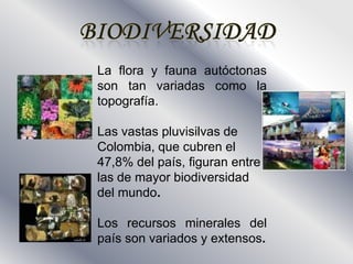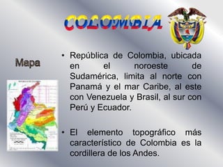 Colombia se ubica en el noroeste de Sudamérica, limita con Panamá, Venezuela, Brasil, Perú y Ecuador, y su elemento topográfico más característico son los Andes. La flora y fauna de Colombia son muy variadas debido a su diversa topografía, y sus extensas selvas figuran entre las de mayor biodiversidad del mundo. La cultura colombiana muestra influencias indígenas, africanas y europeas, y se caracteriza por el mestizaje entre estas corrientes culturales.