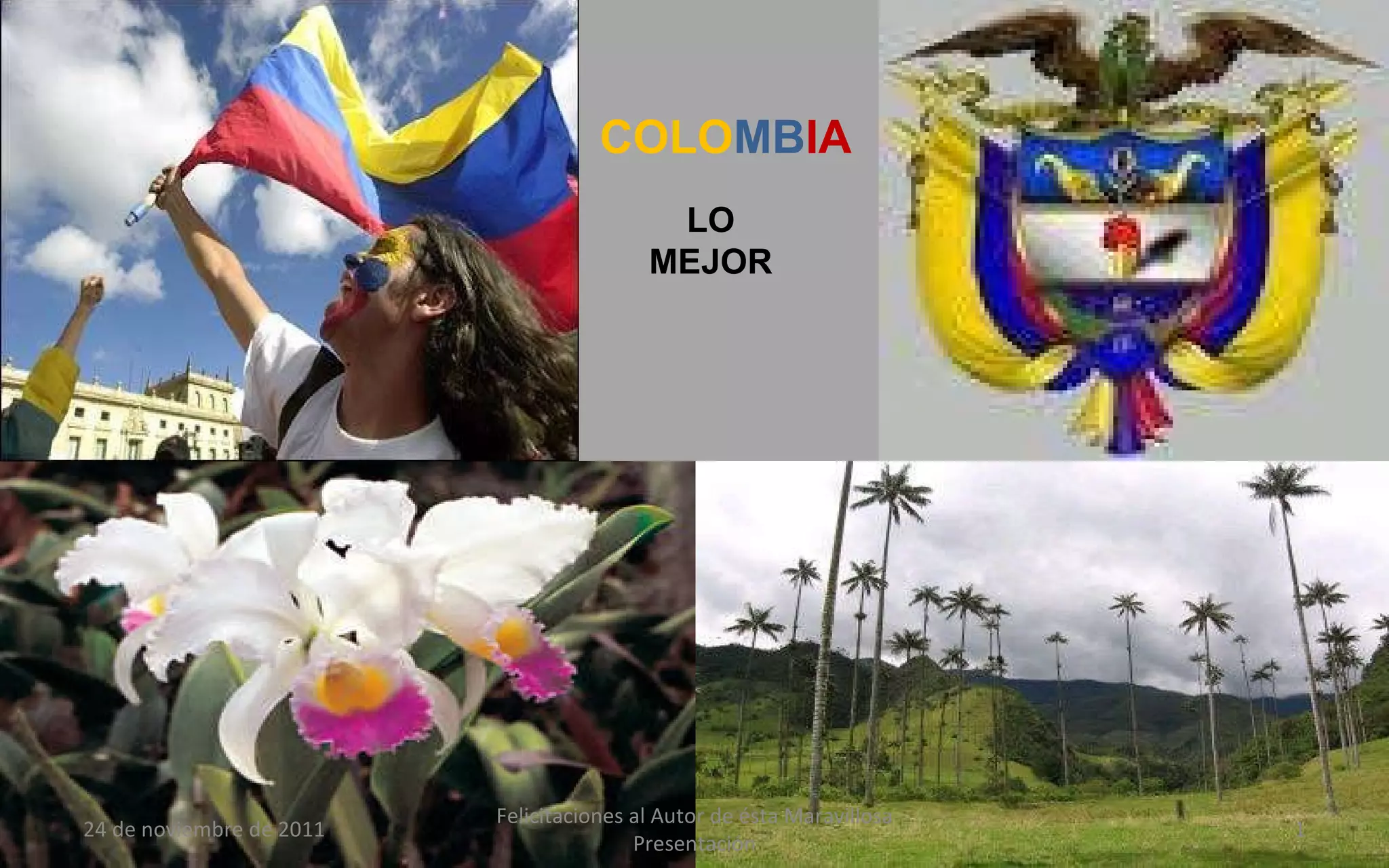 El documento enumera las posiciones de Colombia en diferentes categorías como producción de café, biodiversidad y recursos naturales, destacando que ocupa el primer lugar en ranas, flores y esmeraldas. También resalta logros de colombianos y aspectos que hacen a Colombia única, concluyendo con frases patrióticas sobre el orgullo de ser colombiano.