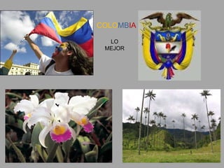 El documento describe los logros y atributos destacados de Colombia. Resalta que Colombia ocupa el primer lugar en producción de café, esmeraldas, cirugías refractivas y diversidad de especies de pájaros y ranas. Además, ocupa altos puestos en producción de banano, biodiversidad, especies de mamíferos, carbón y otros recursos. Destaca la riqueza natural, cultural y económica del país. Concluye expresando orgullo y amor por Colombia.