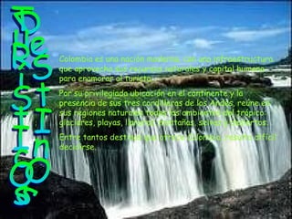 Colombia es una nación diversa con una variedad de destinos turísticos naturales y culturales, incluyendo playas, montañas, selvas, ríos y ciudades con historia e infraestructura moderna que atraen a turistas nacionales y extranjeros interesados en la naturaleza, aventura, cultura e historia del país.