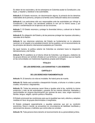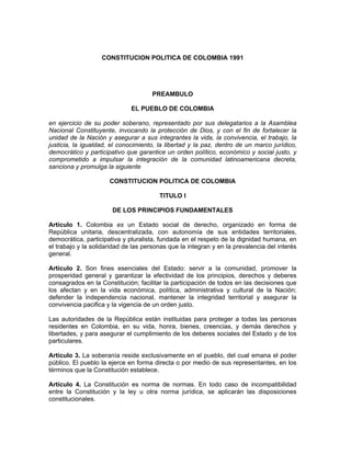 Este documento presenta la Constitución Política de Colombia de 1991. Establece que Colombia es un Estado social de derecho organizado como una república unitaria, descentralizada y democrática. Reconoce y protege una amplia gama de derechos fundamentales de los ciudadanos colombianos, como los derechos a la vida, la igualdad, la libertad de expresión, el debido proceso y la participación política. También define la estructura y los principios del gobierno colombiano.