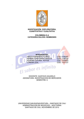 El documento presenta un análisis de mercado de la categoría de dulces bombones de Colombina S.A. Incluye un análisis de la demanda, la competencia, el entorno general e interno, y propone la mezcla de marketing. También incluye investigaciones cualitativas y cuantitativas, y propone estrategias y un mapa estratégico para mejorar el desempeño de los bombones de Colombina S.A.