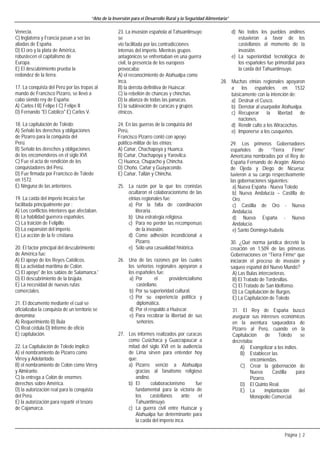 El documento contiene 31 preguntas de opción múltiple sobre la colonización española en América. Las preguntas abarcan temas como los viajes de Cristóbal Colón, la conquista del Imperio Inca por Francisco Pizarro, y las consecuencias políticas y económicas del descubrimiento de América para España y Europa.