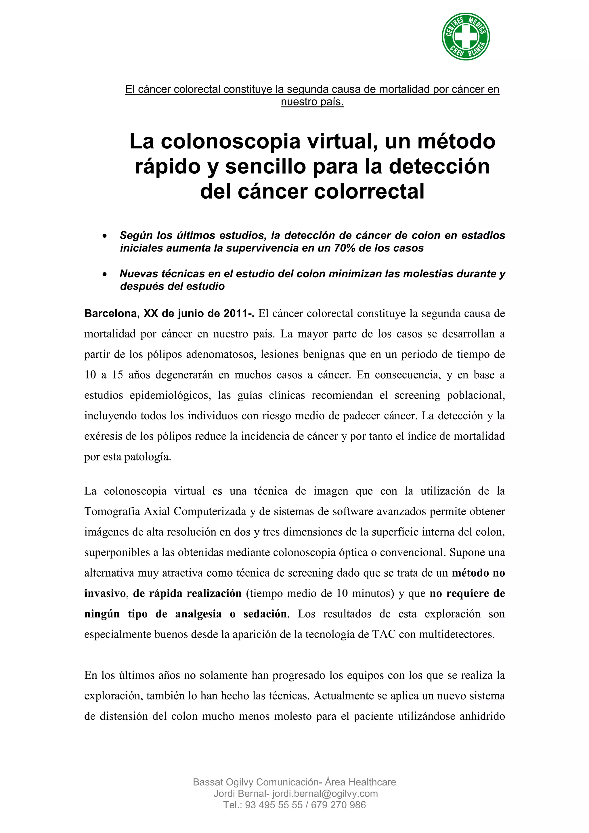 El cáncer colorectal es la segunda causa de mortalidad por cáncer en el país, y su detección temprana puede aumentar la supervivencia en un 70%. La colonoscopia virtual es un método no invasivo y rápido para su detección, superando la colonoscopia convencional en eficacia diagnóstica. Las nuevas técnicas de exploración del colon han mejorado su calidad y han reducido las molestias para los pacientes.