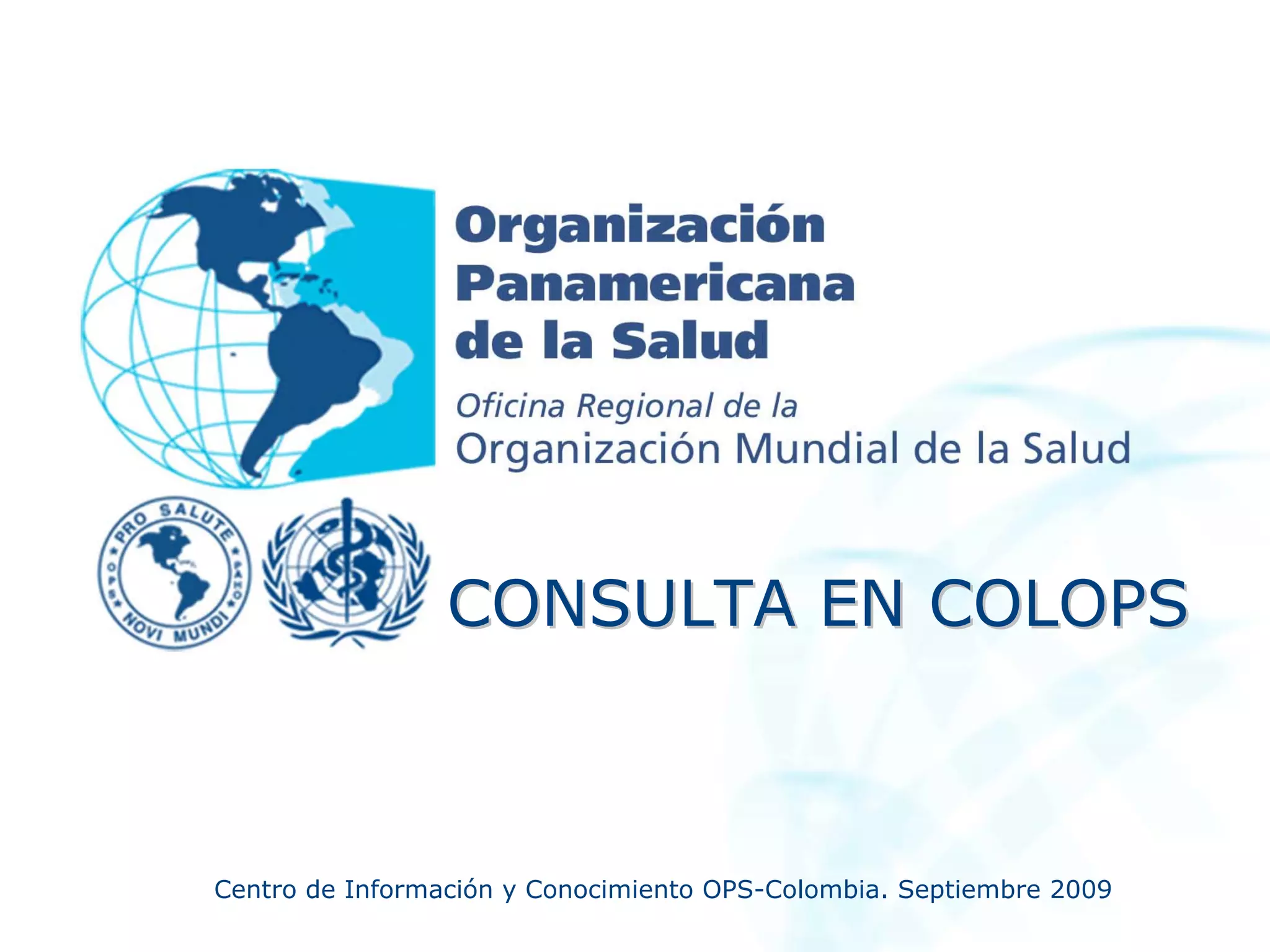 Colops es una base de datos del Centro de Información y Conocimiento de la OPS-Colombia, que ofrece acceso a documentos referenciales y textos completos relacionados con la salud. La plataforma permite realizar búsquedas simples y avanzadas a través de herramientas específicas, y también incluye opciones para enviar resultados por correo electrónico. Los usuarios pueden acceder al contenido mediante la Biblioteca Virtual en Salud de Colombia y a través de la página del centro.