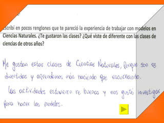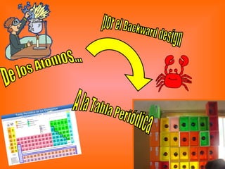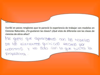 Este proyecto tuvo como objetivo enseñar conceptos químicos como elementos, partículas subatómicas y la tabla periódica de una manera activa y significativa para los estudiantes. Se comenzó indagando sus ideas previas y luego los estudiantes construyeron modelos tridimensionales de átomos utilizando materiales de descarte. Esto les permitió pasar de lo abstracto a lo concreto y desarrollar habilidades científicas. El proyecto se evaluó continuamente a través de la observación de los modelos c