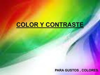 El color es una percepción visual que se genera en el cerebro al interpretar las señales nerviosas que envían los fotorreceptores de la retina. Los seres humanos perciben el color a través de tres tipos de conos que detectan longitudes de onda rojas, verdes y azules. La combinación de estos tres colores primarios puede producir todos los demás colores. El contraste se define como la diferencia de intensidad entre un objeto y su fondo.