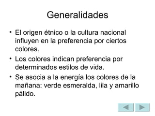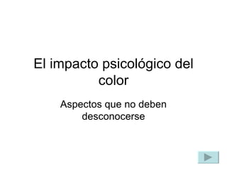 El documento resume los efectos psicológicos de diferentes colores. Explica que el rojo simboliza la sangre y el fuego y es uno de los colores favoritos. El castaño se asocia con la tierra, los bosques y las praderas. El amarillo tiene un fuerte impacto y atrae la atención cuando se usa con negro. El verde simboliza la salud y la frescura. El azul es el más frío pero también el más atractivo y adecuado para alimentos congelados. El negro transmite refinamiento y estimula