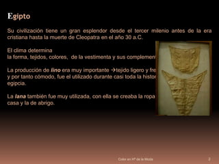 Este documento resume la evolución de la moda y los colores usados en la vestimenta desde la antigua Egipto hasta la Edad Media en 3 oraciones. Los egipcios usaban principalmente el blanco y colores como amarillo, azul y rojo para decorar sus túnicas. Los griegos y romanos usaban lino, lana y seda en una variedad de colores, aunque los esclavos usaban colores más oscuros. Durante la Edad Media, los colores brillantes como púrpura, escarlata y azul representaban ri