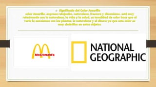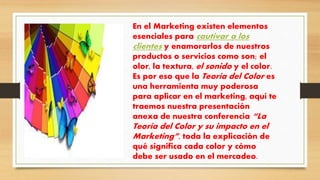 Este documento resume los significados psicológicos de diferentes colores y cómo pueden usarse en marketing. Explica que el azul representa confianza, el rojo atracción y pasión, el verde naturaleza y salud, el naranja juventud y diversión, y el blanco y negro pureza y elegancia respectivamente. Recomienda usar estos colores estratégicamente según el mensaje y público objetivo.