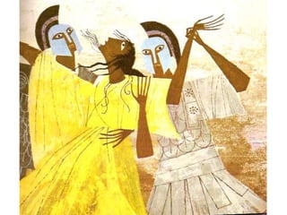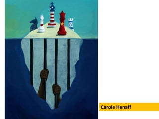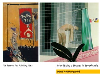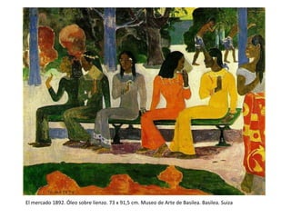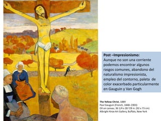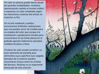 El documento explora el uso del color en la pintura a través de dos modalidades: mimética y expresiva, destacando su aplicación en el arte medieval y asiático. Se mencionan ejemplos de artistas desde el barroco hasta el post-impresionismo, ilustrando cómo el color y el contorno han sido utilizados para expresar intenciones creativas. Además, se citan obras específicas y artistas contemporáneos que han innovado en el uso del color.