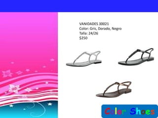 Este documento presenta una lista de zapatos de varios colores, tallas y precios de la tienda Color Shoes. La tienda ofrece zapatos para mujeres con tacón de diferentes alturas en múltiples ubicaciones en Allende, Morelos y Caderaya, Nuevo León. Los clientes pueden pagar al contado o obtener crédito de un mes para compras en la tienda.