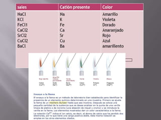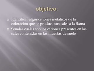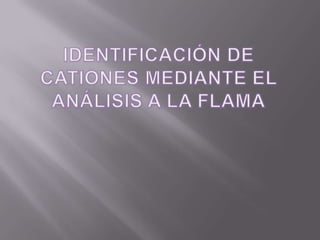 El documento describe un procedimiento para identificar cationes metálicos mediante la coloración que producen al exponer sales de dichos cationes a la llama. Se utilizan sales de sodio, potasio, calcio, hierro, cobre, estroncio, magnesio y cobalto, las cuales producen llamas de color amarillo, violeta, dorado, anaranjado, rojo carmín, azul y amarillo, respectivamente. El procedimiento permite identificar cationes metálicos presentes en muestras de suelo.