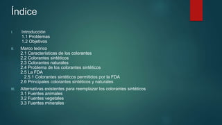 Este documento discute alternativas para reemplazar colorantes sintéticos, los cuales pueden causar problemas de salud. Describe fuentes animales, vegetales y minerales de colorantes naturales como alternativas, incluyendo cochinilla, achiote, curcumina y pimiento. Concluye que los colorantes deben evaluarse continuamente y que los consumidores deben recibir información precisa sobre los aditivos en los alimentos.