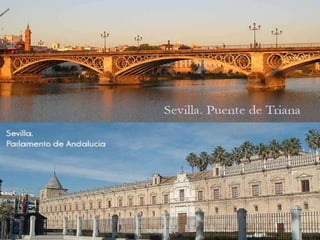 Sevilla ha estado habitada desde el siglo IX a.C. por los tartesos y fue llamada "Hispalis" por los romanos cuando la ocuparon en el 206 a.C. La ciudad fue conquistada por los ejércitos árabes en el 713 d.C. y perteneció al califato de Córdoba hasta que fue reconquistada por Fernando III de Castilla en 1248. La catedral, la Giralda y los Reales Alcázares son los edificios más emblemáticos de Sevilla, que actualmente tiene 700.000 habitantes.