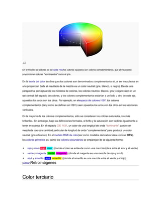 El documento describe diferentes tipos de colores, incluyendo colores análogos, complementarios, terciarios, primarios y secundarios. Explica que los colores análogos son colores vecinos en el círculo cromático que comparten un color en común, mientras que los complementarios son colores opuestos que, al mezclarse, producen gris. También define los colores primarios, secundarios y terciarios y cómo se obtienen a través de la mezcla de colores.