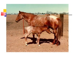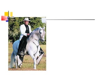 El documento clasifica los pelajes o colores de los caballos en dos grupos: pelajes simples de un solo color y pelajes compuestos de dos o más colores. Los pelajes simples incluyen blanco, negro, alazán y castaño, entre otros. Los pelajes compuestos son capas combinadas como el tordillo, zaino y ruano, que tienen pelos entremezclados, y capas a manchas como el pinto. En total, se describen más de 15 tipos y variaciones de pelajes equinos.