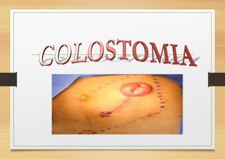 Este documento define una colostomía como un procedimiento quirúrgico donde se extrae un extremo del intestino grueso a través de una abertura en la pared abdominal, de modo que las heces salen por esta abertura o estoma a una bolsa adherida a la piel. Describe los diferentes tipos de ostomías según su función, tiempo de permanencia y órgano implicado, y ofrece detalles sobre los cuidados requeridos para una colostomía, incluyendo la higiene, colocación del dispositivo y posibles complicaciones. También