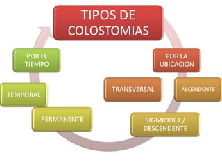 Este documento describe una colostomía, un procedimiento quirúrgico donde se crea una abertura en el abdomen para desviar las heces fuera del cuerpo. Explica que una colostomía se realiza cuando hay obstrucción intestinal, cáncer de colon u otras complicaciones, y permite que las heces salgan del colon antes de llegar al colon descendente. También detalla los dos tipos de colostomía, ascendente y descendente, sus características y ubicaciones, así como posibles complicaciones e implicancias para el paciente.