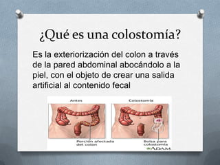Este documento proporciona información sobre colostomías. Explica que una colostomía es la exteriorización del colon a través de la pared abdominal para crear una salida artificial de las heces. Las colostomías se realizan cuando parte del intestino está dañado o no puede funcionar correctamente. Detalla los tipos de bolsas de colostomía, los cuidados de la piel y la bolsa, y aclara que con una colostomía se puede llevar una vida normal e incluso practicar deportes.