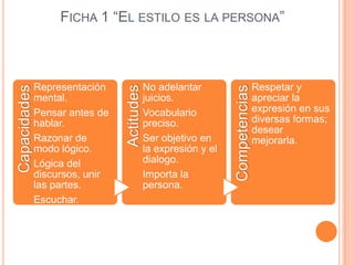 Este documento contiene 4 fichas que describen habilidades, actitudes y competencias relacionadas con el lenguaje y la comunicación. Cada ficha se enfoca en un tema diferente como el razonamiento lógico, la búsqueda de certezas, el uso del lenguaje para enseñar y aprender, y la imaginación. Las fichas describen capacidades como pensar de manera lógica, recopilar información de manera sistemática y crear problemas. También describen actitudes deseables como no adelantar juicios, valorar la exact
