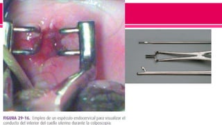 Este documento describe el procedimiento de colposcopia, que involucra el examen del aparato genital femenino con un microscopio binocular para detectar células anormales. Explica cómo se usan tinciones como ácido acético y Lugol durante el procedimiento, y cómo la colposcopia es el segundo paso en el diagnóstico de lesiones cervicales como CIN o SIL. También detalla los hallazgos normales e anormales que pueden observarse, y cómo las imágenes anormales requieren una biopsia para confirmar el diagnó