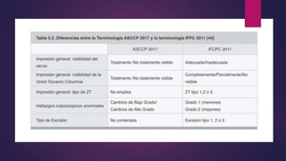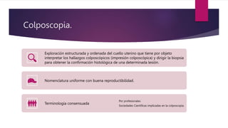 La colposcopia es una exploración del cuello uterino que permite identificar lesiones cervicales intraepiteliales, conocer su localización y características, y dirigir la biopsia para obtener la confirmación diagnóstica. Se realiza generalmente entre los periodos menstruales y sus indicaciones incluyen citologías anormales, infección por VPH, y factores de riesgo como enfermedades de transmisión sexual. La colposcopia sigue estándares internacionales para la clasificación y terminología de las lesiones.
