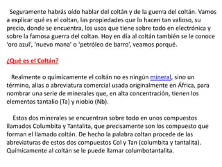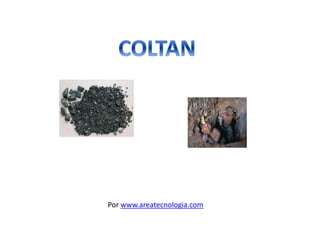 El coltán es un término usado para referirse a los minerales columbita y tantalita, los cuales contienen elementos como tantalio y niobio. Estos elementos, especialmente el tantalio, son valiosos para la industria electrónica debido a que permiten crear condensadores más pequeños y con mayor capacidad de almacenamiento. El coltán se extrae principalmente de la República Democrática del Congo, donde existen conflictos armados relacionados con el control de las minas de este mineral.