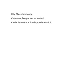 Las hojas de cálculo están compuestas de filas en horizontal, columnas en vertical y celdas que son cuadros individuales donde se puede escribir y almacenar información.