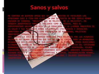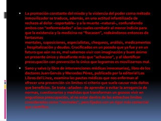 El documento habla sobre los daños de la industria de la salud y la promoción constante del miedo. Argumenta que esto causa estrés y otras reacciones patológicas en los individuos. También critica la medicalización excesiva que confunde dolor y muerte natural con enfermedades, lo que rodea a las personas de fantasmas mentales, análisis y deudas médicas. Finalmente, resume el libro "Sano y salvo" que examina las pautas médicas que nos enferman al ofrecer una prevención sin límit