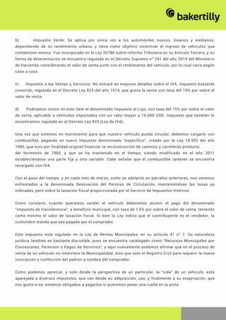 Este documento resume los principales impuestos asociados a la compra y uso de un vehículo en Chile. Estos incluyen el permiso de circulación, impuesto verde, IVA e impuesto al lujo al momento de la compra, así como también el impuesto específico sobre los combustibles. Cada año se debe renovar el permiso de circulación y al momento de vender el vehículo se paga el impuesto de transferencia. En total son varios los tributos que una persona debe asumir durante la "vida" de un vehículo desde su adquisición hasta su enaj