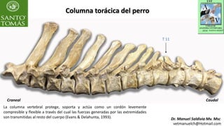 La columna vertebral protege la médula espinal y soporta el cuerpo, transmitiendo las fuerzas de las extremidades al resto del cuerpo. El documento presenta información sobre Dr. Manuel Saldivia, un veterinario con especialización en columna vertebral canina.